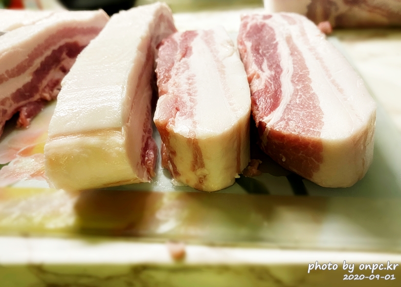 지방 비율이 좀 많은 부위의 삼겹살입니다. 고기와 지방 중 지방 비율이 더 많네요~ㅋ