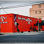 진장동 메가마트 근처의 주황색 건물이 몇달 전부터 보였는데 드디어 오픈했네요. 돈가스와 파스타 전문의 이달이는 프렌차이즈가 아니라 눈여겨보다 들려봤어요. 강열한 주황빛의 건물에 검은 톤의 어닝만 있으니 심플하며 이뻐보이네요. 외관부터 구경해봐요~ 글자만 LED로된 글자형 간판이에요. 밤에 찍은 사진은 카메라의 상태가 않좋아 못올리겠네요. 밤에 봐도 이뻐요. 입구인데 양옆전부 이런 디자인으로 오른편이 남자 화장실이 있으며 반대 왼편에 여자화장실이 있어요. 입구에 들어가면 주요 메뉴의 배너가 보이네요. 상당히 높은 천장의 구조에 등이 이쁘게 주렁주렁 달려있어요. 한쪽 벽면에 디자인용 현수막으로 이쁘게 메뉴 소개가 있네요. 천장이 높아 시스템 냉난방기의 바람이 강해서 등몇개가 흔들리네요. 이쁜 컬러풀한 의자로..
