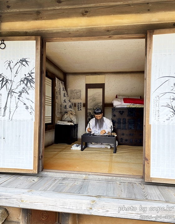 초가집 작은 방안에는 낮은 상에 책과 호롱불 그리고 뒤에는 붓글씨와 그림이 걸려있어요.
