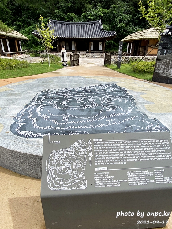 입구에는 18세기에 제작된 여지도에 실린 장기현 모습을 볼 수 있는 지도가 돌 위에 새겨져 있어요.