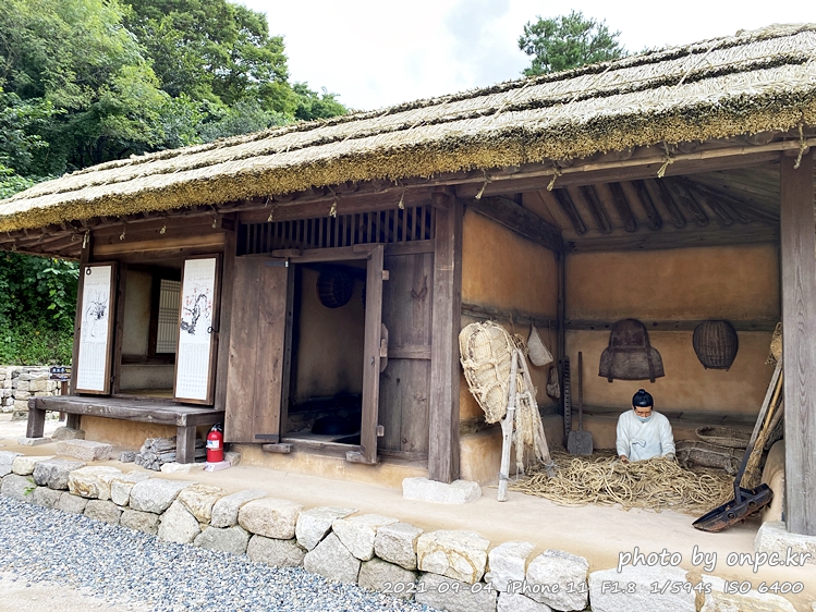 한복과 마스크를 착용한 사람이 앉아서 볏짚으로 가마니 짜기와 새끼줄 꼬기를 하는 모습을 재현해 놓았어요.