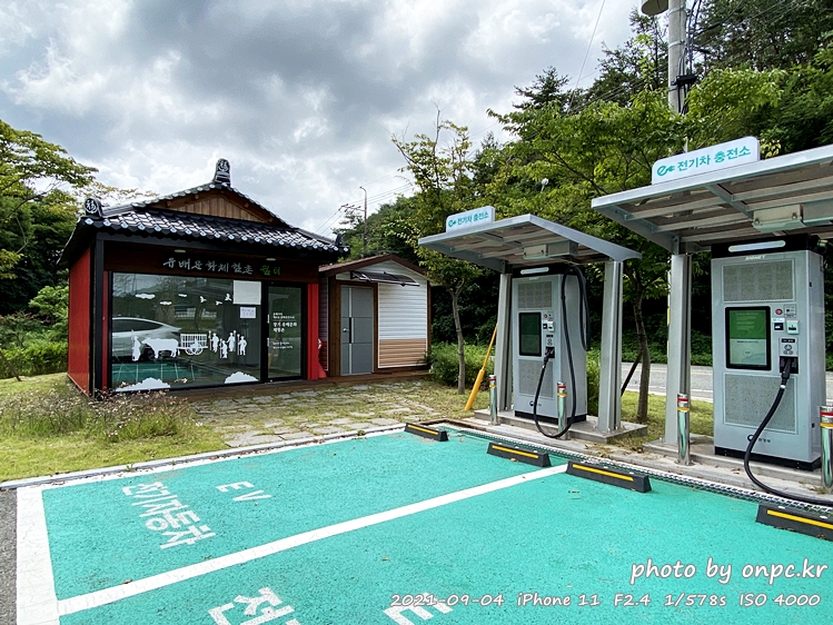 충전소 옆 빨간 기와 건물은 유배문화체험촌 쉼터지만 임시 폐쇄 상태예요.