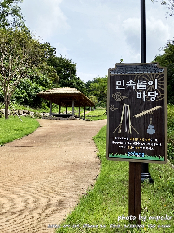 주변에 민속놀이를 즐길 수 있는 그네, 널뛰기, 투호 놀이가 있어요. 쉴 수 있는 작은 정자도 있고요~