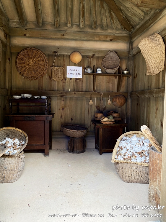 절구, 소쿠리, 키, 바가지 등 식기류가 정리되어 있고 수확한 목화솜은 광주리에 한 가득 담아뒀어요.