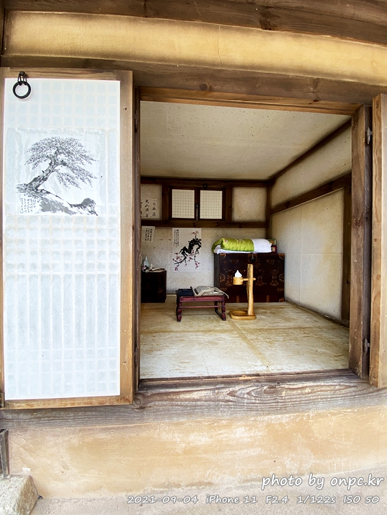 방안에는 풀을 먹이고 주름진 옷감을 펴는~ 다듬이질할 때 사용되는 다듬잇돌과 나무 방망이가 보입니다.