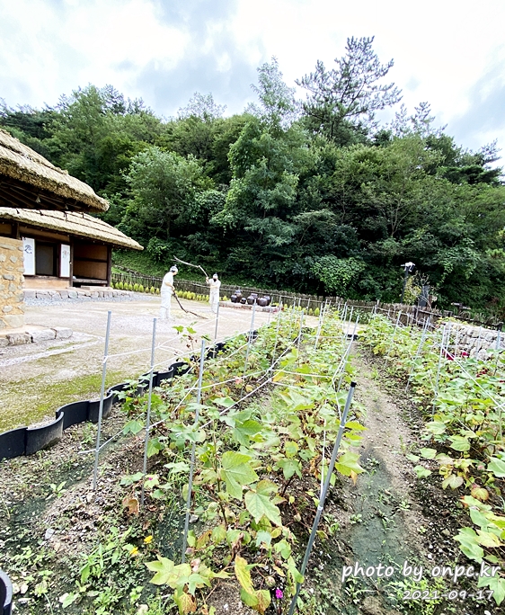 마당 한편에 심어 놓은 것이 무언가? 가까이 가서 살펴보니 목화가 심어져 있네요.