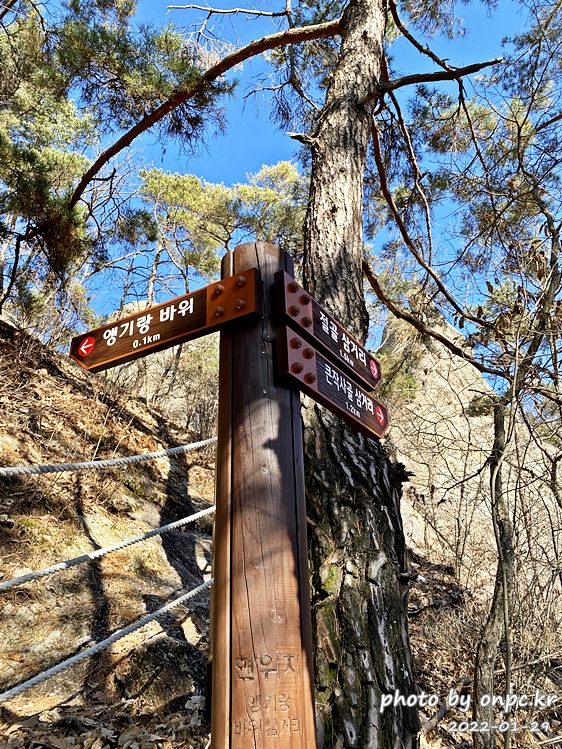 나무 이정표 앞에 도착~ 여기서 앵기랑 바위까지는 0.1km