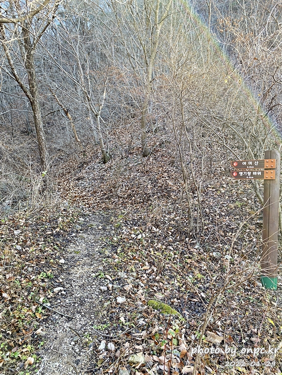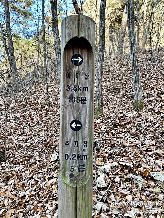 다 내려와 보니 아미산, 앵기랑 바위 길을 알려주는 나무 이정표가 입구에 세워져 있네요.