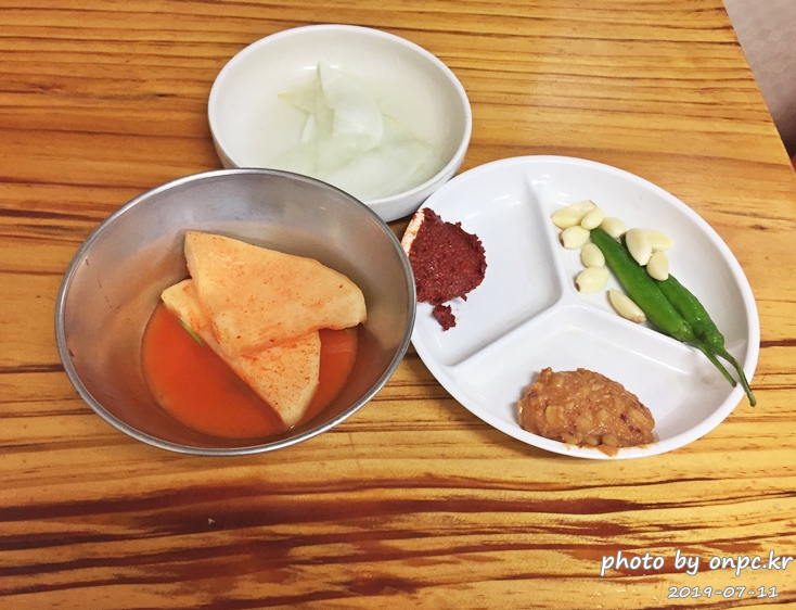 그리고 다진 양념, 된장과 고추 마늘, 무 절임, 간장 소스. 반찬은 간단합니다.