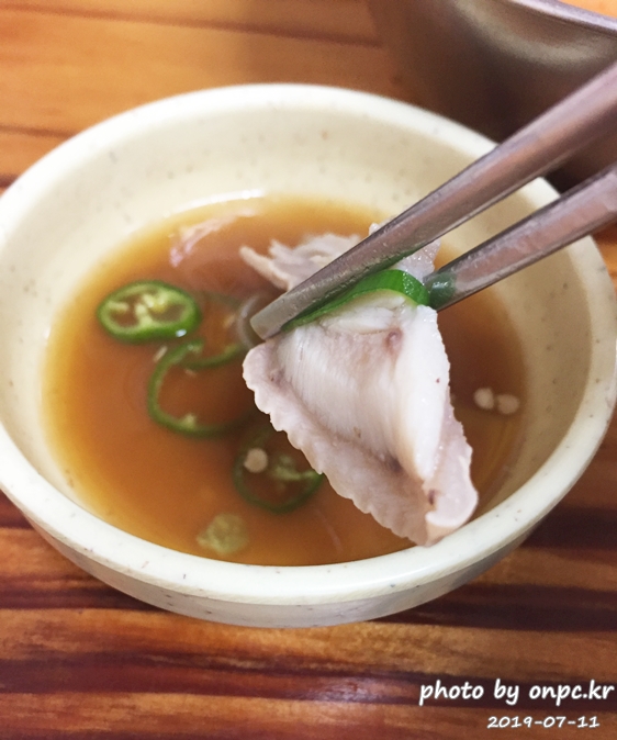 간장 소스에 살짝 찍고~ 소스 안에 썰어 넣은 매운 고추도 얻어서 같이 먹어봤어요.
