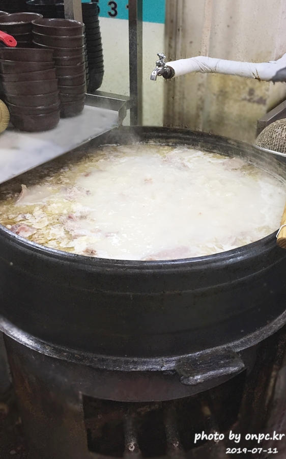 큼지막한 가마솥에서 연신 끓고 있는 곰탕. 골목에 들어서면 가게 앞에서 볼 수 있는 광경이에요.