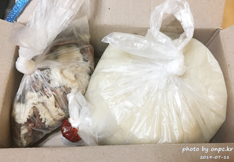 박스를 열면 곰탕과 고기, 다진 양념이 들어있어요. 냉장고에 넣고 여러 번 나눠서 맛있게 먹었습니다.