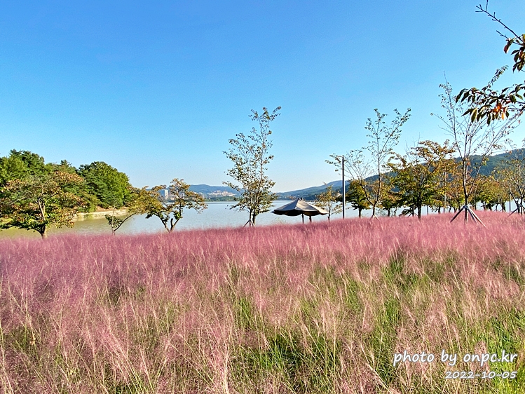 파라솔과 벤치가 공원 곳곳에 있어서 조용히 핑크뮬리도 보고 보문호 물멍도 할 수 있어요.