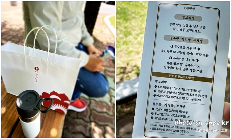 이상복경주빵 선물포장 종이백과 보관방법과 냉동 후 맛있게 먹는 법등이 적혀있어요.