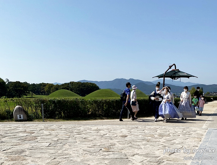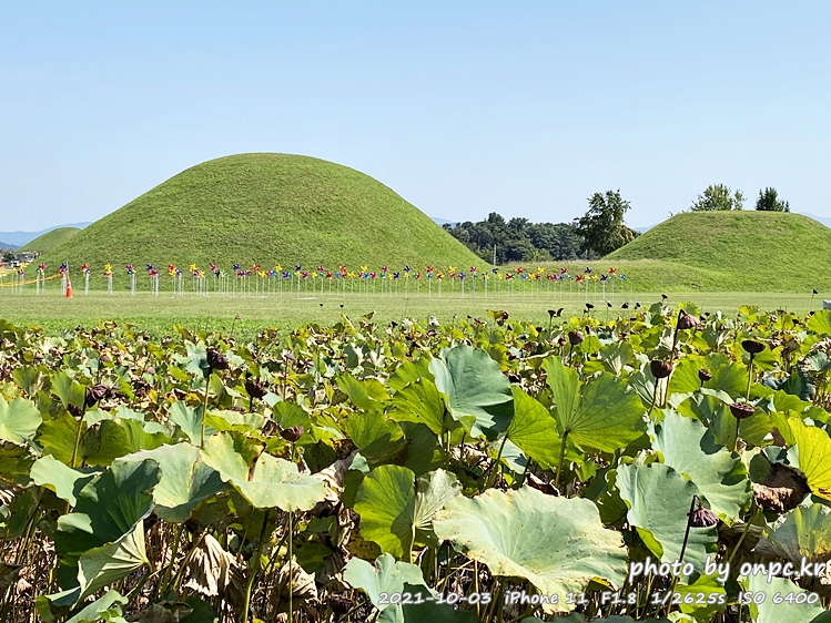 잘 관리되고 있는 고분과 색색깔 바람개비가 돌고 있는 풍경이 아름답네요~