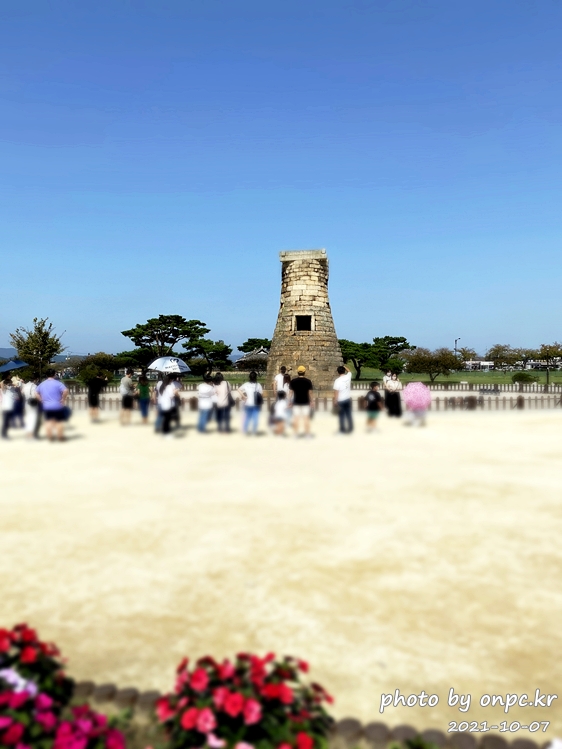 붉은 꽃밭 끝에 늠름히 서 있는 첨성대~