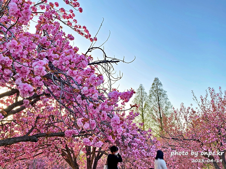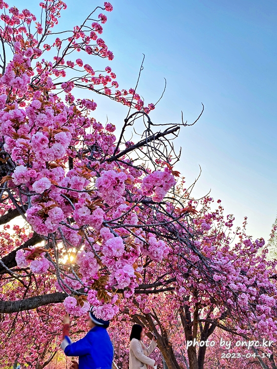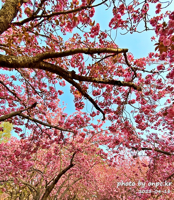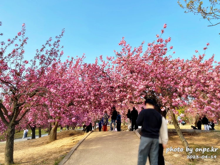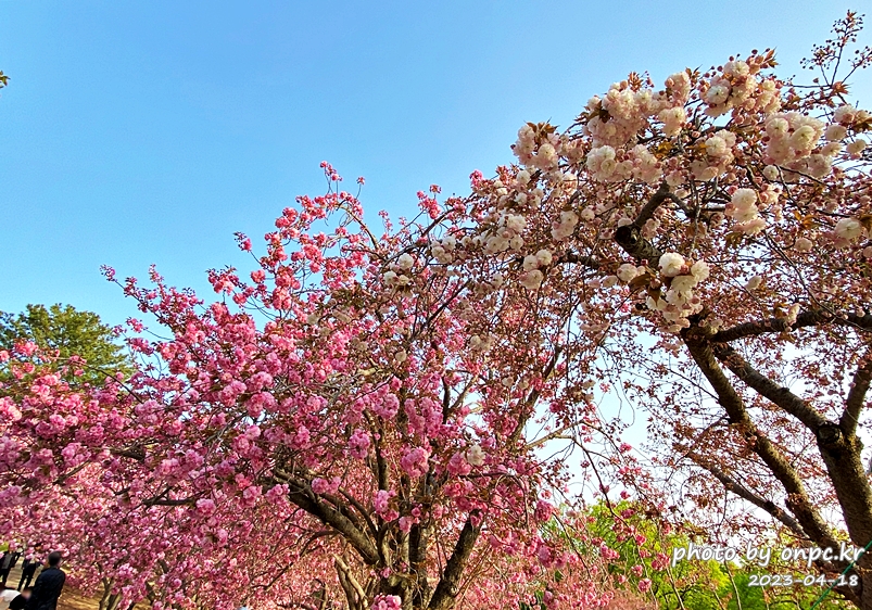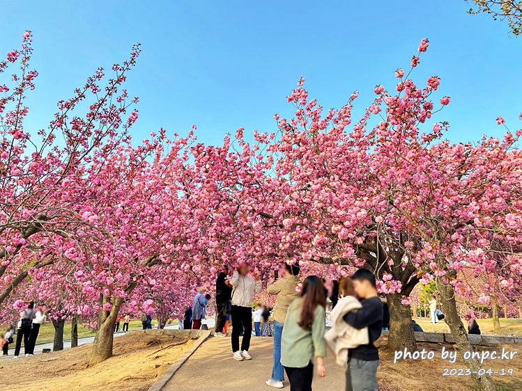 사진에서 가운데 통행 길을 중심으로 우측에는 일반벚꽃, 좌측에는 겹법꽃이 핍니다.