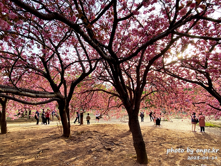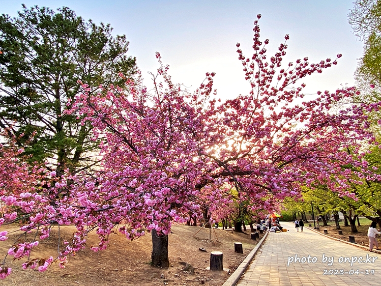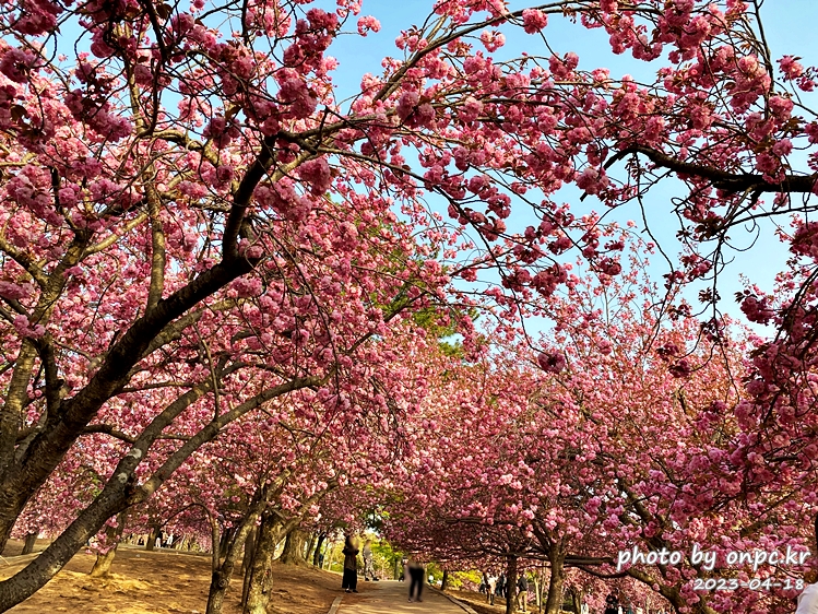 사진에서 가운데 통행 길을 중심으로 우측에는 일반벚꽃, 좌측에는 겹법꽃이 핍니다.