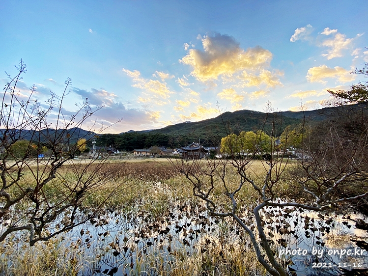 같은 위치에서 봄(2019년 4월)에 찍은 화랑정과 연못 풍경이에요.