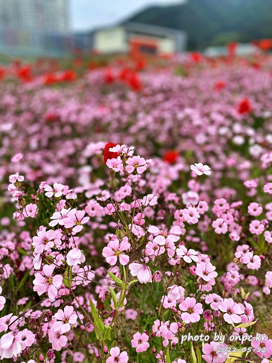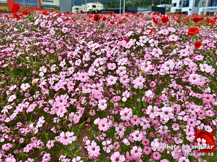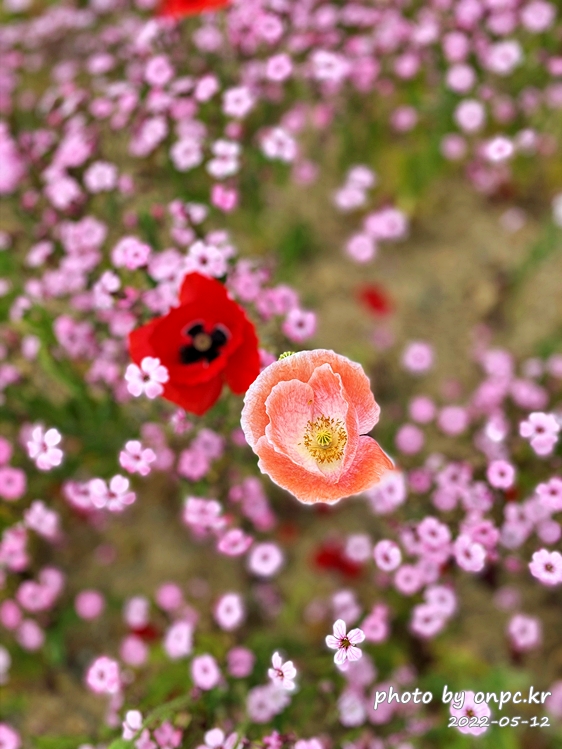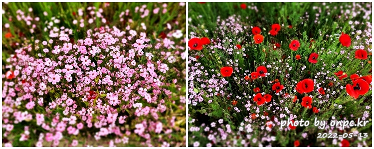 하얀 안개초가 만발하던 건너편 길을 건너면 분홍 안개초와 빨간 꽃양귀비가 가득합니다.