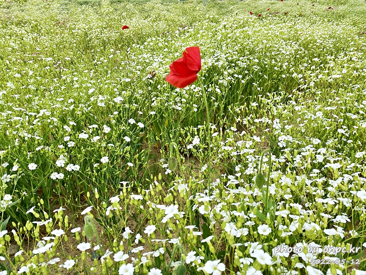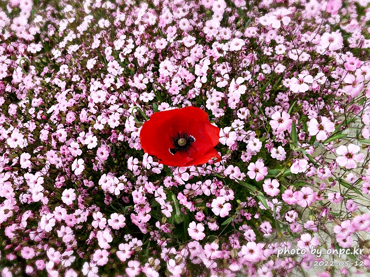 하얀 안개초 꽃밭 사이로 화사한 빨간 양귀비 꽃이 예쁘게 피어 눈에 띕니다.