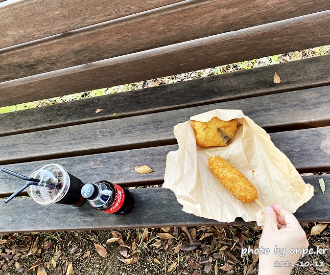 간식으로 따뜻하게 막 나온 치즈 핫도그 하나 팥 도넛 하나 사서 근처 벤치에서 먹었어요.ㅎ