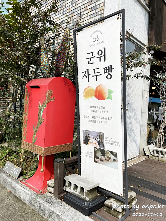 군위 자두 빵 입간판 옆에는 1년 후에 배달되는 느린 우체통이 설치돼 있어요.