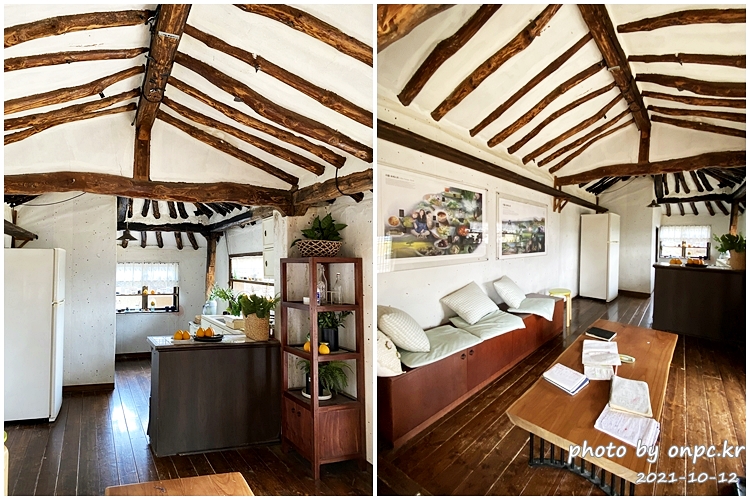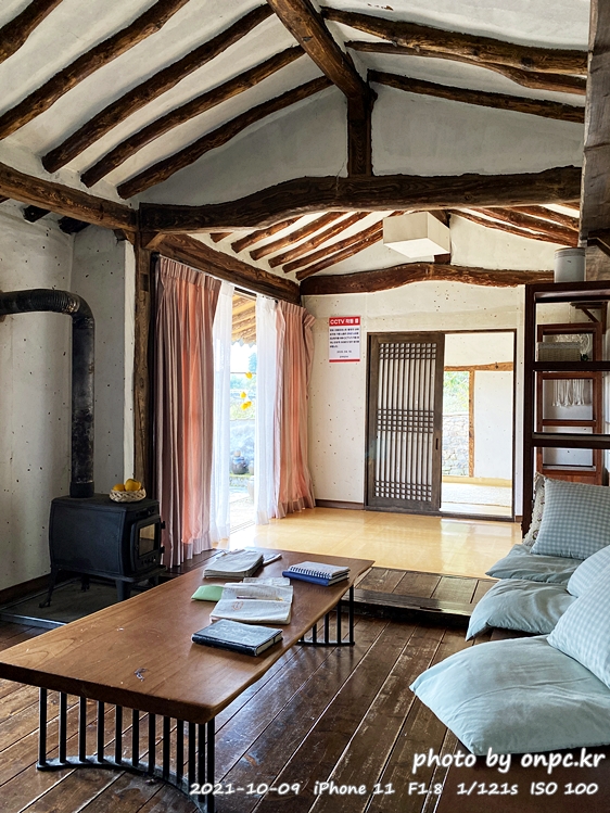 천장에는 한옥 서까래의 모양이 노출되어 있고 나무 바닥과 장판 오래된 난로까지 예전 시골집 풍경 같네요.