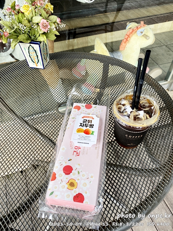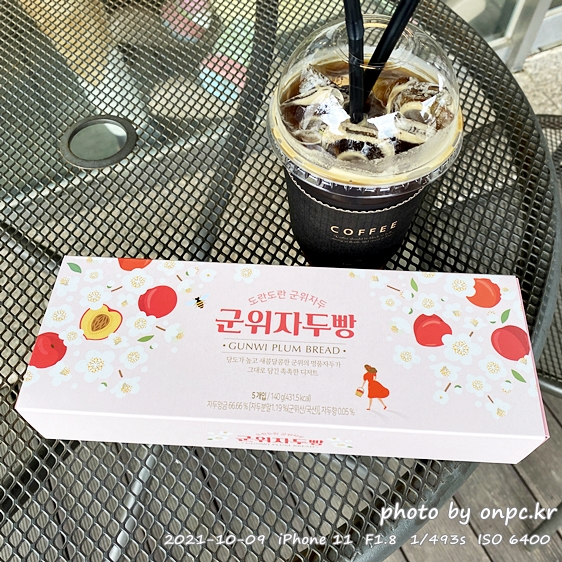 아이스 아메리카노 한 잔과 자두 빵 작은 박스 하나를 샀어요.