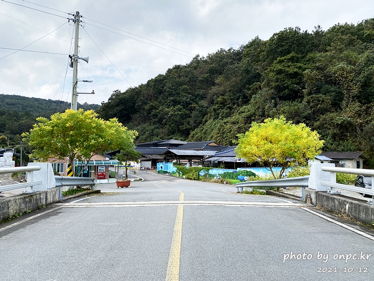 작은 다리를 건너면 나무 옆 왼쪽으로 마을 회관과 정자가 있고 오른쪽으로 가면 촬영지예요~