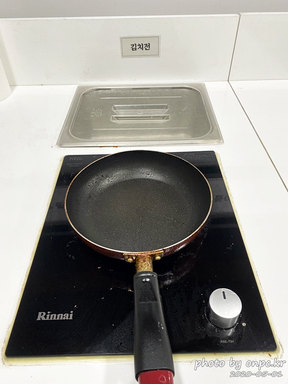 반죽이 통에 담겨있고 먹을 만큼 덜어서 셀프로 김치전을 부쳐 먹을 수 있어요.