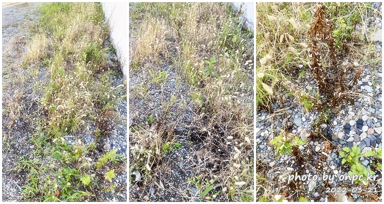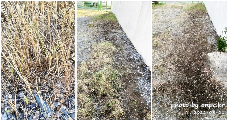 이렇게 끝이 말라서 죽은 풀은 큰 힘 들이지 않고도 잘 뽑혀서 잡초 제거에 아무래도 좀 수월해요.
