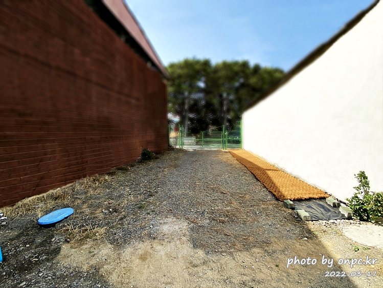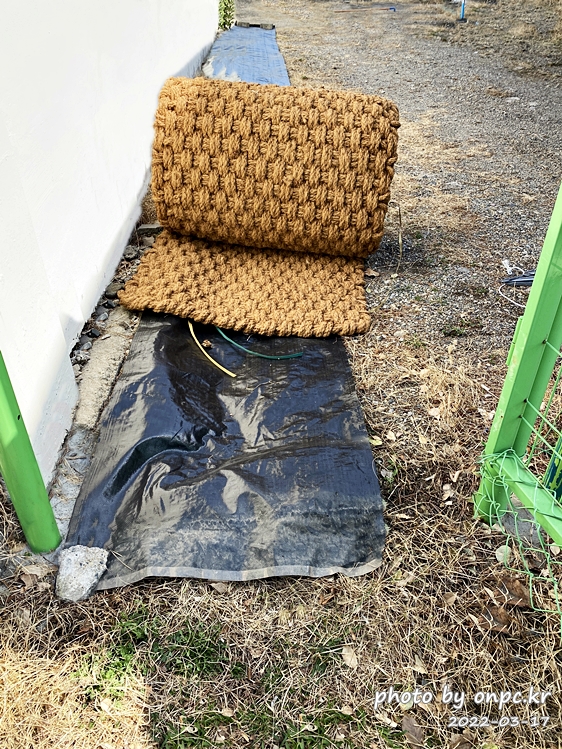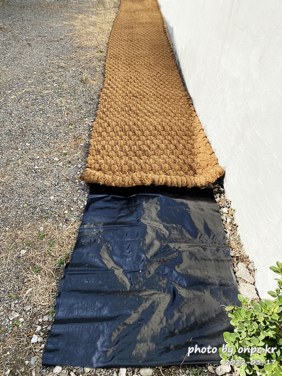 출입문인 휀스 작은 문 앞에서 부터 제초매트를 깔고 그 위에 야자매트를 깔아봅니다.
