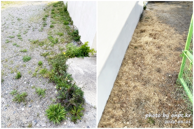 약 1~2주 지나서 보니 오~ 풀들이 뿌리 쪽으로 제법 죽었고 질긴 쑥도 누렇게 말라서 죽었네요.
