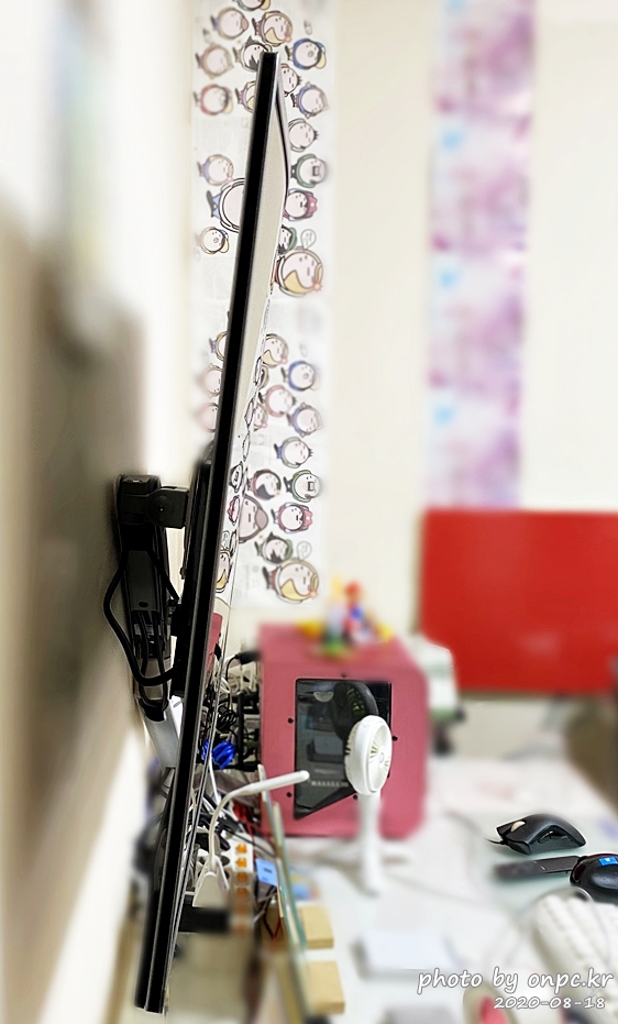 작업 후 쉬는 시간이나 영상 감상할 때는 모니터를 벽에 밀착할 수 있어요. 100% 책상 공간 활용입니다~