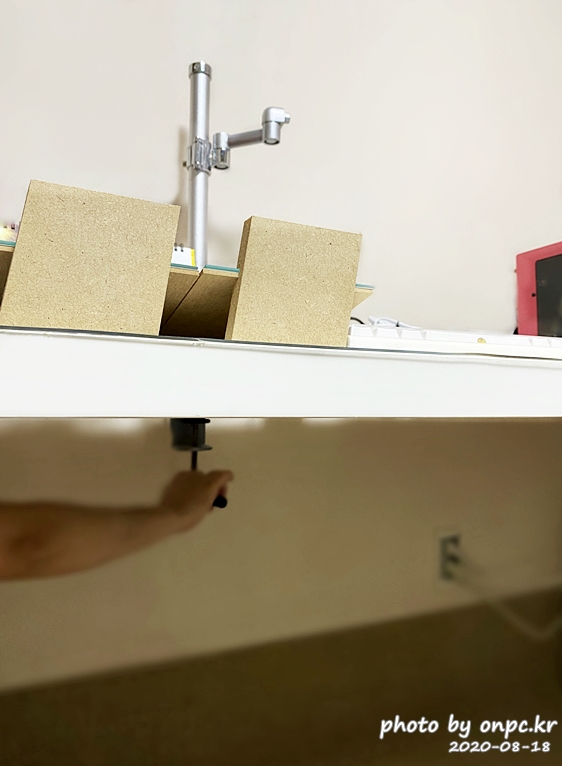 책상에 본체 하단 부분을 클렘프로 설치했을 때 모습이에요. 단단하게 고정되고 안정적입니다.