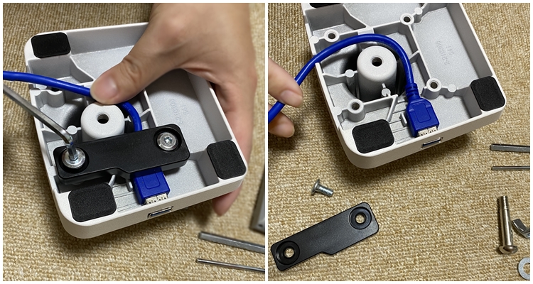 하단 본체에 스탠드를 꽂은 후 측면 나사 구멍에 작은 육각볼트를 조여서 고정해줍니다.