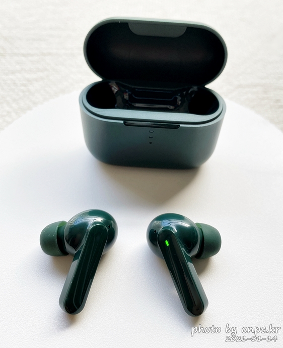 QCY-T10 그린. 뚜껑 열고 한 바퀴 돌려서 찍어봤어요.
