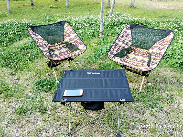 접이식 캠핑 의자와 사용하면 높이도 맞고 테이블 하나만 펴도 커피 한잔 하기에 적당해요.