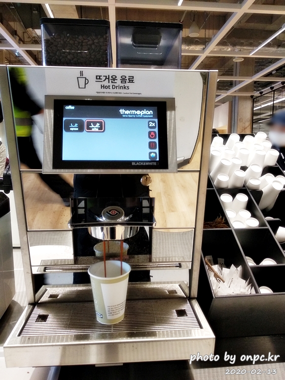 커피를 주문하면 빈 컵을 주고 커피머신 기계에 가서 커피를 내려 마시면 됩니다.