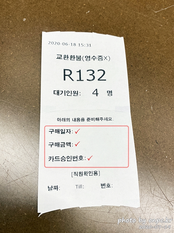 위 사진 표시된 3곳: 반품할 상품의 구매일자, 구매금액, 카드승인번호를 적고 순서를 기다립니다.