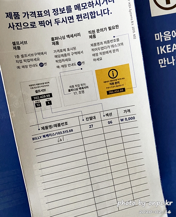 종이에는 제품명/제품번호, 진열대, 섹션 번호, 가격 적는 란이 있어요.