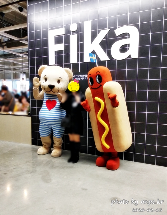 피카 앞에서 파블레 르 비에른 곰 인형과 스웨덴 국기를 꼽고 있는 핫도그 인형과의 포토타임.