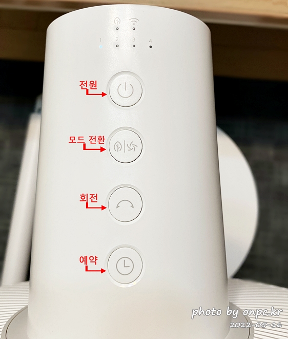 전원을 켜면 바람 세기를 나타내는 위 숫자(1,2,3,4)에 표시되고 와이파이 연결되면 Wifi 아이콘 아래 파란빛이 점등됩니다.
