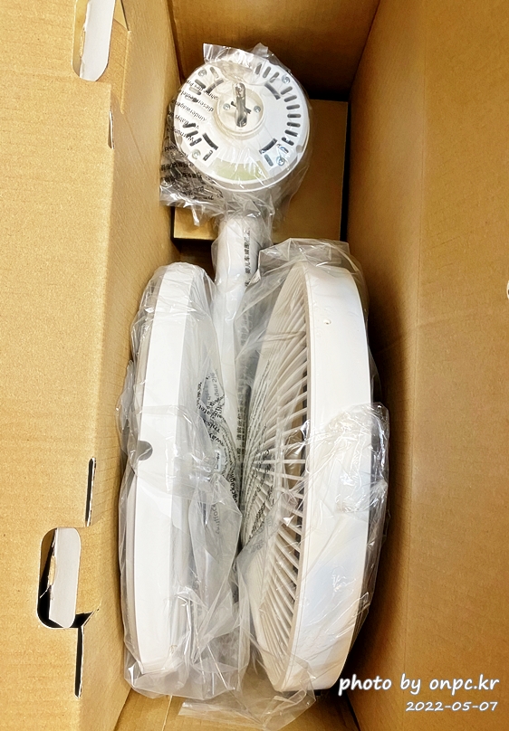 박스를 열어보면~ 얇게 분해되어 포장된 선풍기가 보입니다.