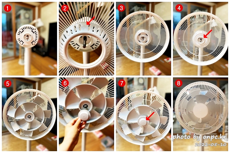 ⑥⑦선풍기 날개 설치하기: 선풍기 날개 조립 부품 노브(세척 불가능)를 끼우고 시계 반대 방향으로 돌려 선풍기 날개를 고정해줍니다.