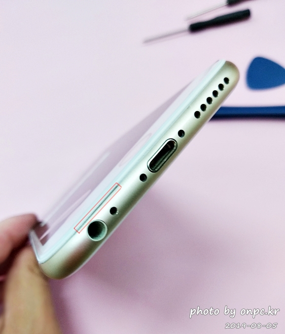 약간 벌어진 하단 부분에 액정과 케이스 사이 얇은 플라스틱 삼각 오프너를 이용해서 살짝~ 들어서 조심히 열어줍니다.