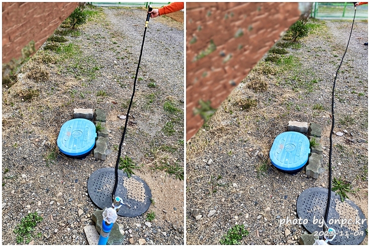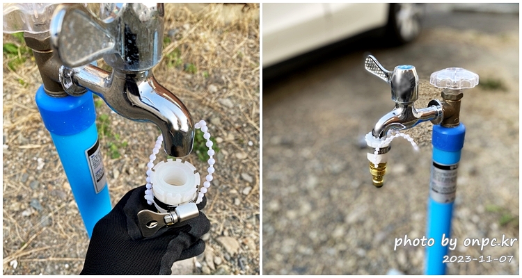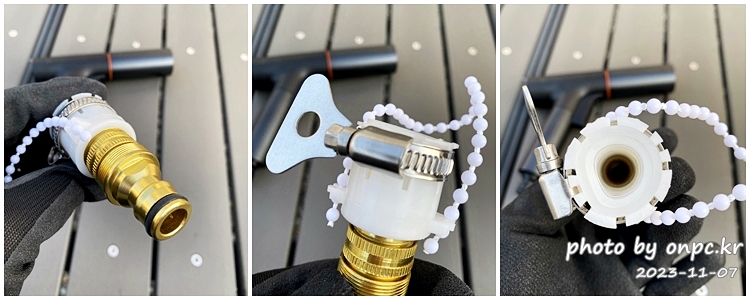 마당에 있는 일반 수도꼭지에 부품을 연결하고 빠지지 않게 꽉 체결해 줬어요.