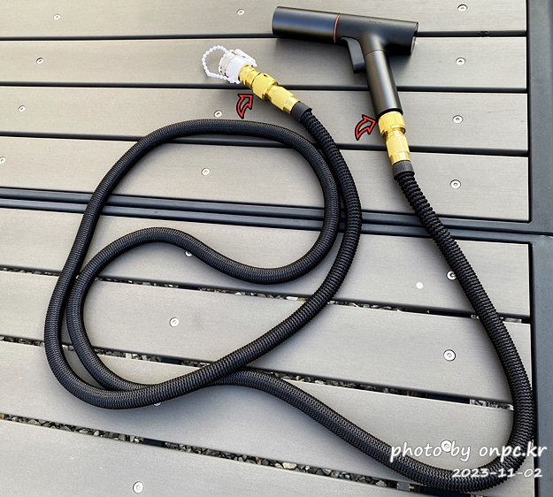스프레이 건에 호스 연결하고 수도 쪽노즐과 호스를 연결해 주면 끝!