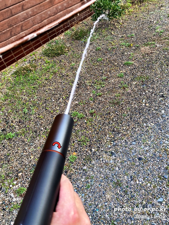 일자로 쭉 뻗는 직사에서 점점 옆으로 물줄기가 퍼지며 분무 모드로 바뀝니다.